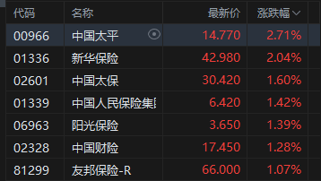 保险股午后拉升,中国太平涨超2%。开源证券发布研报称,监管部门从监管机制、渠道、产品和服务等多方面持续规范保险业健康发展。渠道方面,短期内个险渠道发展承压,银保高质量发展初见成效,多元化渠道布局的头部险企有望受益。产品方面,分红险转型已成行业共识,后续各险企将进一步深化转型。养老需求旺盛,分红型储蓄类保单兼具保底和弹性的收益率,同时在保险保障、养老和医疗配套服务上具有独特优势,未来头部险企市占率有望提升,预计上市险企未来新单保费保持平稳增长,预定利率调降带来负债成本逐步回落;分红险转型带来资产端持续增配权益资产,关注长端利率变化影响。