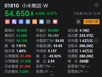 小米跌超8%。9月25日,小米举行新品发布会,发布小米17系列及众多科技家电新品。小米全系列价格方面,小米17价格4499元起,17Pro起售价4999元,小米17Pro Max起售价5999元(12GB+512GB)。雷军谈iPhone17与小米17,表示iPhone17也做得非常好,这次更新被称为牙膏挤爆了,但是iPhone17在硬件配置上与小米17比还是有差距。同时,小米推出汽车推出定制服务,计划三年设计100款车漆。